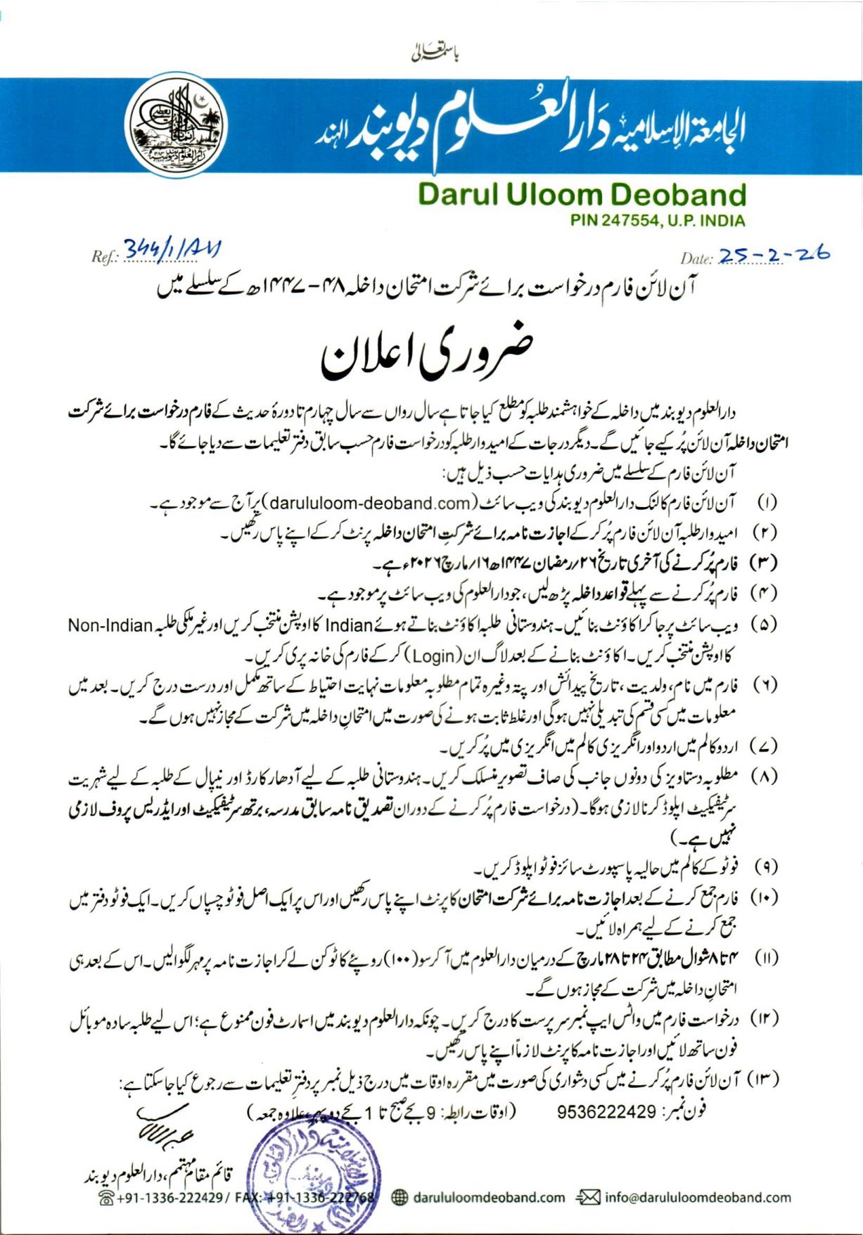 آن لائن فارم برائے شرکت امتحان داخلہ ۴۸-۱۴۴۷ھ آن لائن فارم برائے شرکت امتحان داخلہ پُر کرنے کے لیے اس لنک پر کلک کریں۔ قواعد داخلہ QAWAID DAKHLA 1447-48Download آن لائن فارم سے متعلق ضروری معلومات Guidelines – LatestDownload